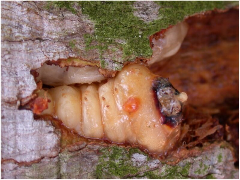 Sau khi được bố mẹ sinh sản, đẻ trong các vết nứt cây, ấu trúng con sẽ tiếp tục công việc tàn phá, gặm nhấm thân cây mà bố mẹ chúng đã từng làm. Chúng ăn chủ yếu gỗ ở trong thân, hút chất dinh dưỡng để sinh trưởng và phát triển khỏe mạnh. Trung bình trong một thân cây, chúng sẽ ăn liên tục từ 1 đến 3 năm.